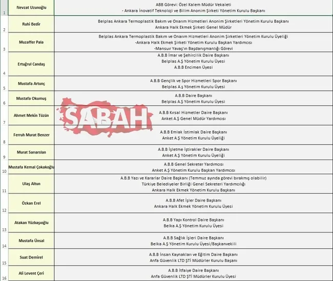 34 üst düzey bürokratın 20’sinin daire başkanı olduğu ve ayrıca 2’si daire başkanı 4 bürokratın ise 2’den fazla görevi olduğu ortaya çıktı. ABB’ye bağlı şirketlerde yönetim kurulu üyesi olarak atanan isimlerin maaşlarına ek gelir sağladıkları belirlendi. Örneğin, Ankara Halk Ekmek, Belplas, Anfa, Anket ve Belka gibi şirketlerde birden fazla pozisyonda bulunan yöneticiler dikkat çekiyor. Bu durum, kamu kaynaklarının etkin kullanımı konusunda soru işaretleri oluşturuyor.
